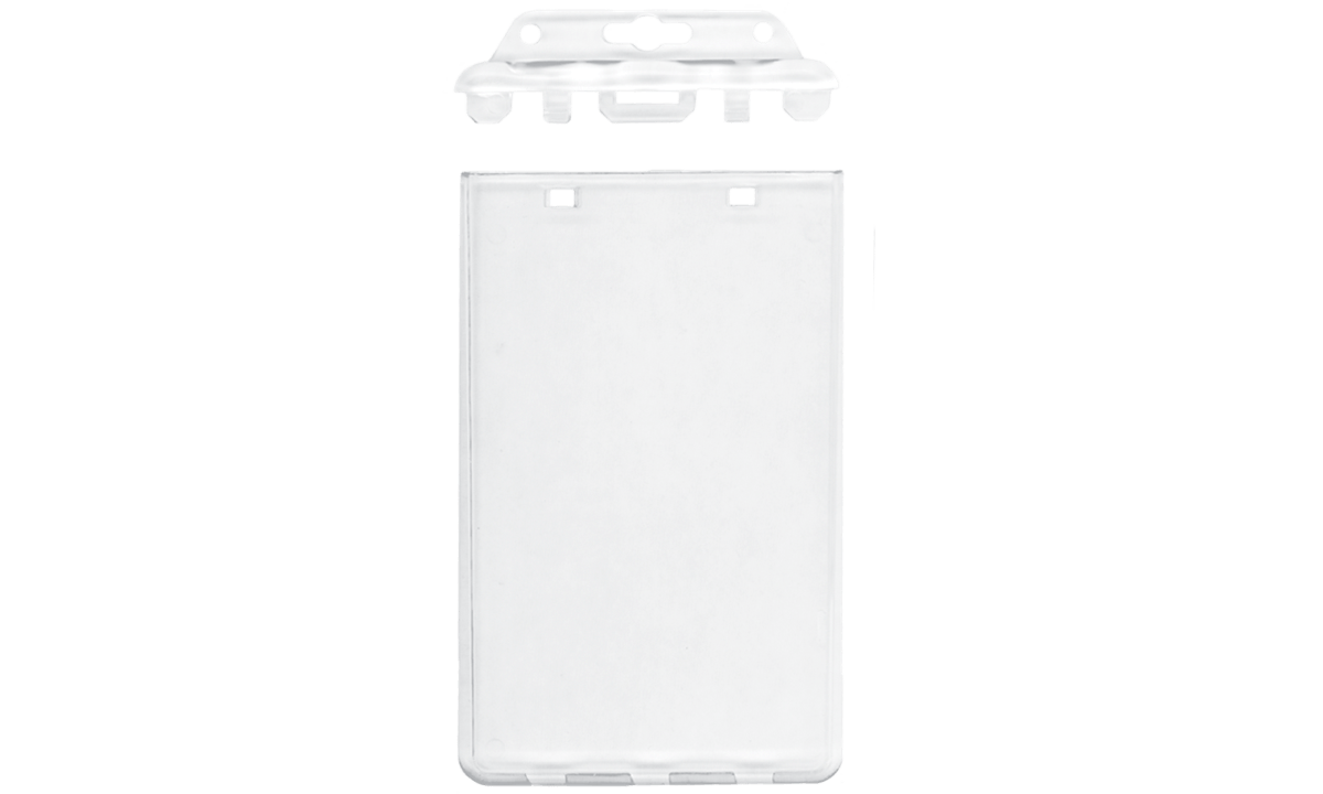 Permanently lock cards inside! Clear thick ABS material with permanent locking end-piece. Holds two cards vertically.
